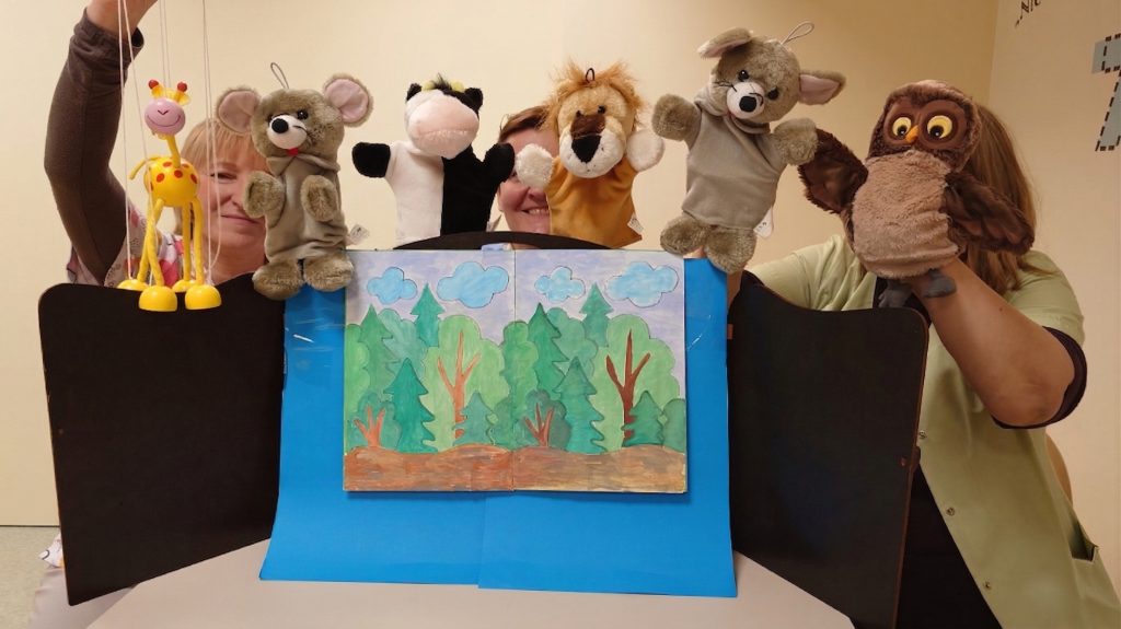 Międzynarodowy Dzień Teatru przypadający na 27 marca był doskonałą okazją dla uczniów z oddziałów: Neurologii, Nefrologii oraz Onkologii i Hematologii (N3) do spotkania z małą formą teatralną – Teatrzykiem pacynek w wykonaniu nauczycieli zajęć pozalekcyjnych i wychowania przedszkolnego. Wcielili się oni w dwie myszki, krowę, sowę, lwa i żyrafę –