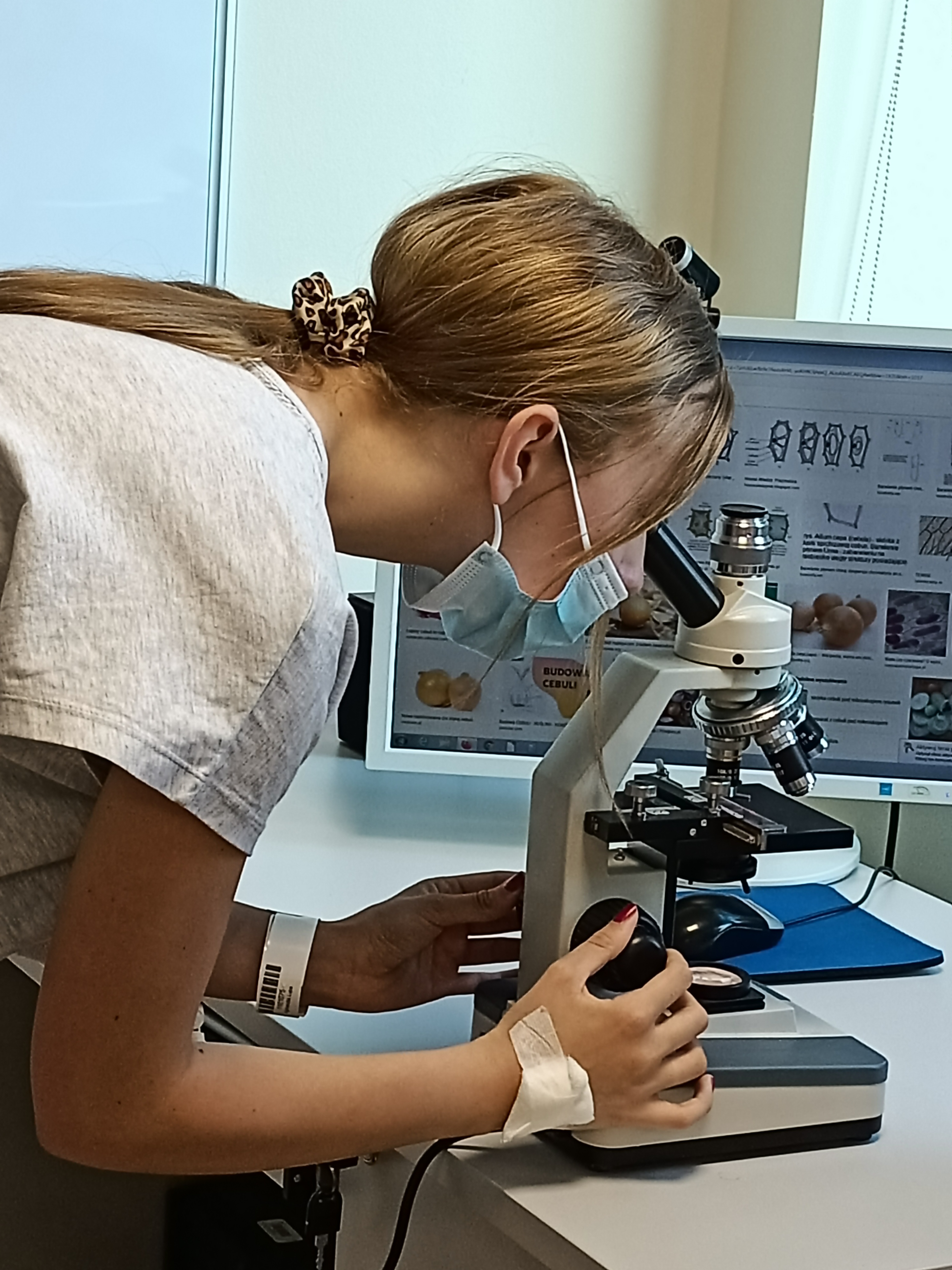 Kącik przyrodniczy zaproponował podróż do świata mikro, w którym uczniowie mieli możliwość obejrzeć komórki skórki cebuli w przygotowanych przez siebie preparatach.