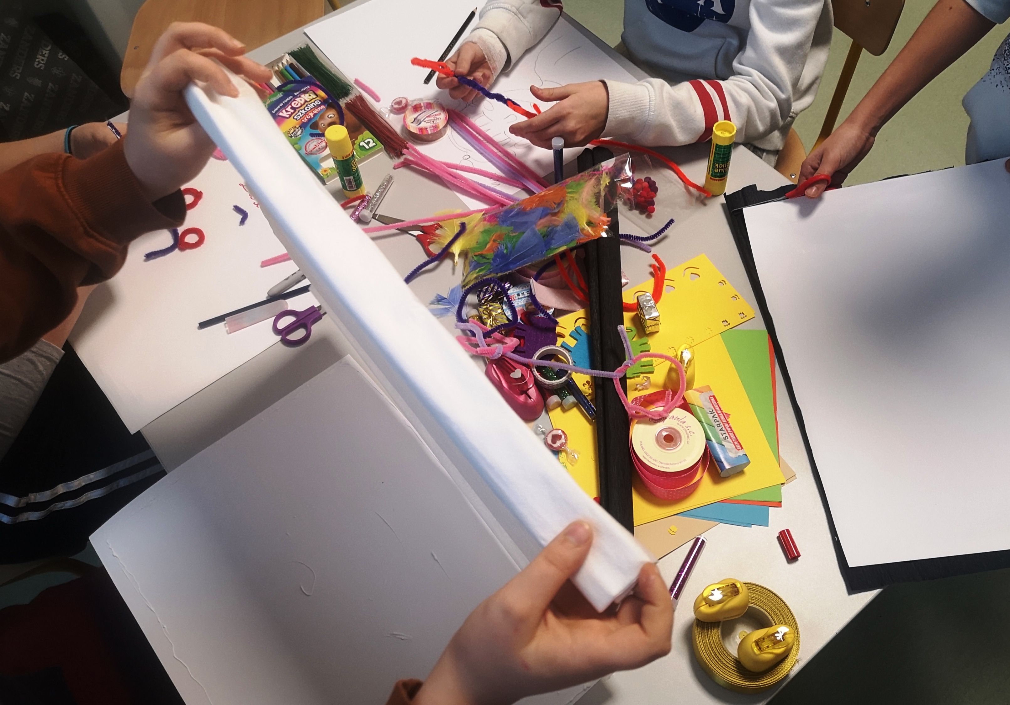 Następnie uczniowie otrzymali siatki różnych brył w celu ich złożenia, bez użycia kleju. Otrzymali również siatki innych brył, by kontynuować zabawę na swoich