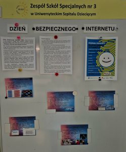 W szkolnym korytarzu pojawiła się tematyczna gazetka przygotowana przez uczniów, przedstawiająca najważniejsze zasady bezpiecznego korzystania z Internetu. Starsi uczniowie stworzyli własne prezentacje w PowerPoincie i Canvie, w których omówili m.in. . ochronę danych, cyberprzemoc, hejt oraz sposoby zabezpieczania urządzeń. Młodsi uczniowie natomiast zapoznali się z przygotowaną przez nauczycielkę informatyki prezentacją dotyczącą podstawowych zasad bezpieczeństwa w sieci.
