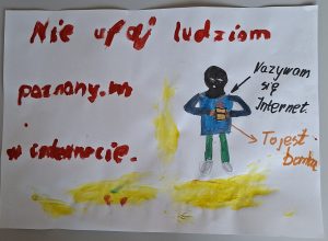 Młodsze dzieci wysłuchały audycji dla dzieci o bezpieczeństwie w Internecie i na jej podstawie ułożyły hasła i zaprojektowały dwa plakaty. Te hasła to: