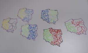 Zadanie dla uczniów – w otrzymane kontury Polski, na podkładkach z mapami konturowymi, należy wrysować dorzecza Wisły i Odry.