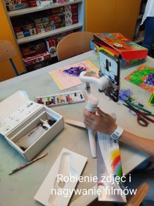 Uczeń zapoznaje się działaniem sprzętu audiowizualnego będącego wyposażeniem Laboratorium Przyszłości i wraz z koleżanką wykonują próbne zdjęcia w/w narzędziami.