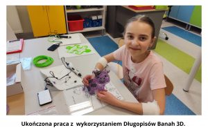 Uczniowie podczas zajęć pozalekcyjnych wykorzystali długopisy Banach 3D zakupione w ramach programu „Laboratoria Przyszłości”. Najpierw wszyscy zostali poinstruowani o zasadach obsługi sprzętu oraz bezpieczeństwie jego użytkowania. Następnie wybrali interesujące ich szablony i kolory filamentu, a następnie z zapałem przystąpili do pracy. W trakcie zajęć dzieci rozwijały zdolności manualne oraz kreatywność projektując i realizując własne pomysły. Zajęcia z długopisami Banach 3D mocno zaktywizowały wychowanków oraz dostarczyły uczniom wiele pozytywnych emocji i radości.