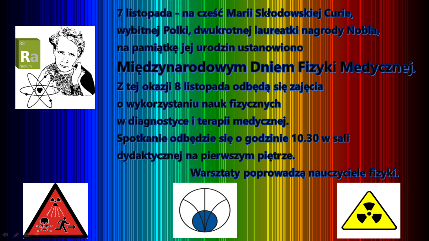 Od roku 2013 obchodzimy Międzynarodowy Dzień Fizyki Medycznej, ustanowiony na cześć wielkiej Polki Marii Skłodowskiej Curie w rocznicę jej urodzin – 7 listopada.
