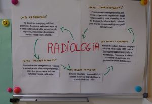 Uczniowie zapoznali się z pracą radiologa przygotowując plakat, następnie poznali historię wynalazcy promieni rentgenowskich, a także mogli we własnych rękach potrzymać jak i obejrzeć zdjęcia rentgenowskie.