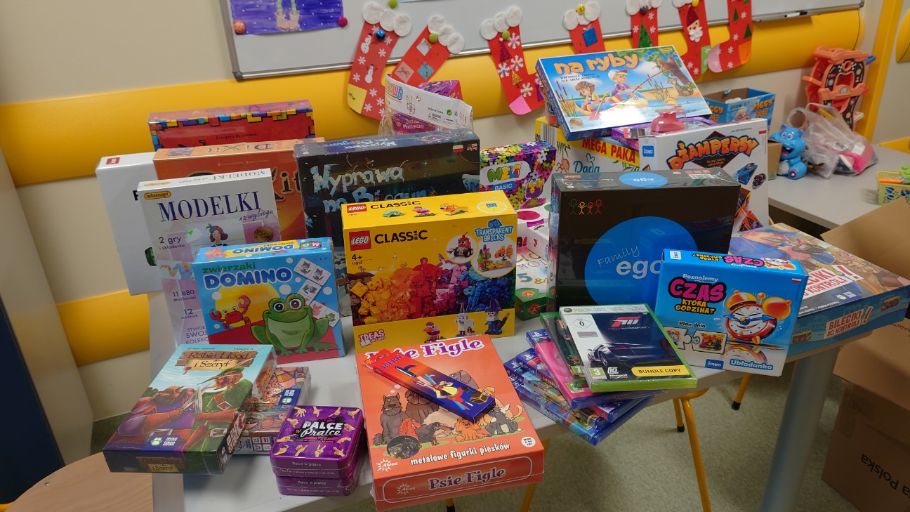 Dnia 20.12.2021 r. sala zabaw oddziału Onkologii i Hematologii (N3) została obdarowana grami planszowymi, grami na konsole oraz materiałami kreatywnymi przez uczniów ze Szkoły Podstawowej im. Karola Szymanowskiego w Osielcu. Z tych pięknych górskich okolic wszystkie te podarunki osobiście przywiózł nam nauczyciel tej szkoły: Pani Angelika Sajbor. Gry te będą umilały czas uczniom/dzieciom ale też będą pomagały w pracy doradcy zawodowego (Dixit, Jak żyć Panie Premierze?, Imago).