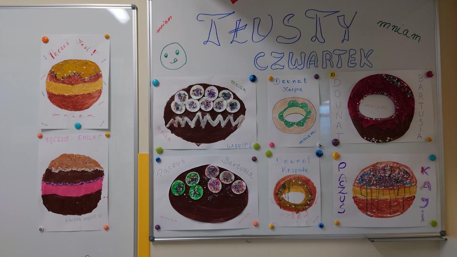 W dniu dzisiejszym (24.02.2022) dzieci/uczniowie z oddziału Onkologii i Hematologii (N3) z okazji Tłustego Czwartku uczestniczyły w zabawie „Jak powstaje pączek”. Następnie wykonały te pyszne pączki i donuty, które ozdobiły tablicę w sali zabaw. Tym sposobem każdy nabrał jeszcze większej ochoty by skosztować ten pyszny pączuś.